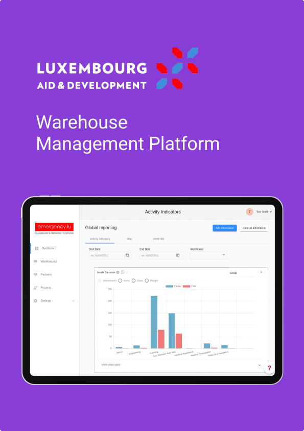 Emergency.lu is a public-private partnership by the Ministry of Foreign Affairs of Luxembourg in collaboration with a consortium of Luxembourg companies and organisations: SES, HITEC and Luxembourg Air Rescue. It is designed to help the humanitarian and civil protection community in the field to (re-) establish telecommunication services and support effective communication and coordination of first responders. Emergency.lu can be deployed by the Government of Luxembourg anywhere in the world within hours of a natural catastrophe or man-made crisis. To help sort these challenges, Relief Applications developed a web platform called Warehouse Management System (WMS) to be used by warehouse operators and managers alike. The solution entailed the development of both a web and mobile application to allow such organization to manage stock in real-time: keep track of their stock in different warehouses through movement creation, project and user management and creation of visual dashboards. The mobile app also allows users to work more quickly by accessing data through QR codes scan.